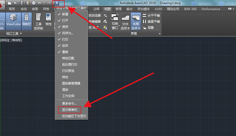 2、然后直接點擊最上方的下拉箭頭,選擇“顯示菜單欄”。