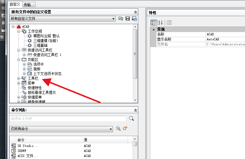 6、打開自定義,將工具欄添加進新的工作空間就可以了。