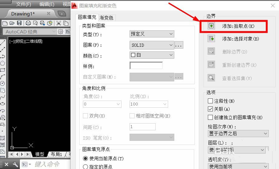 7、圖案設置為:SOLID,顏色任意,點擊添加:拾取點。