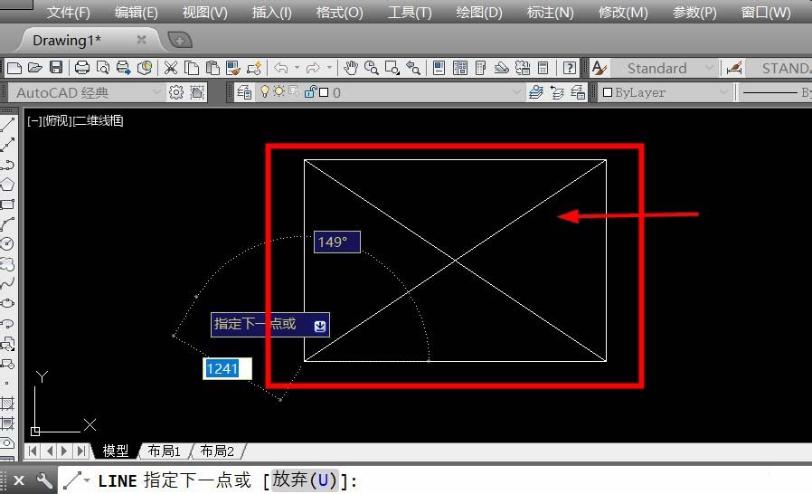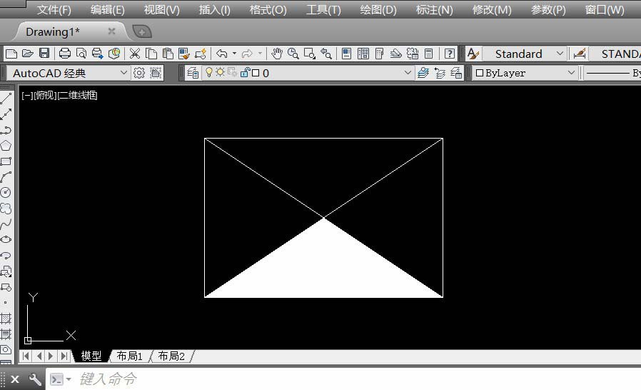 5、利用直線命令,連接矩形內對角,形成兩條對角線。