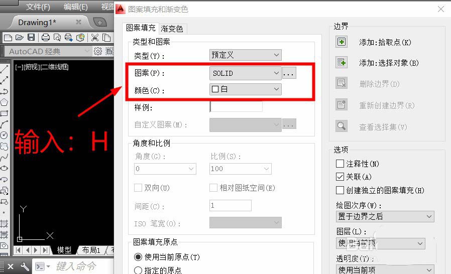 6、輸入命令:H,按下空格鍵。窗口填充窗口,設置圖案為:SOLID,顏色任意。
