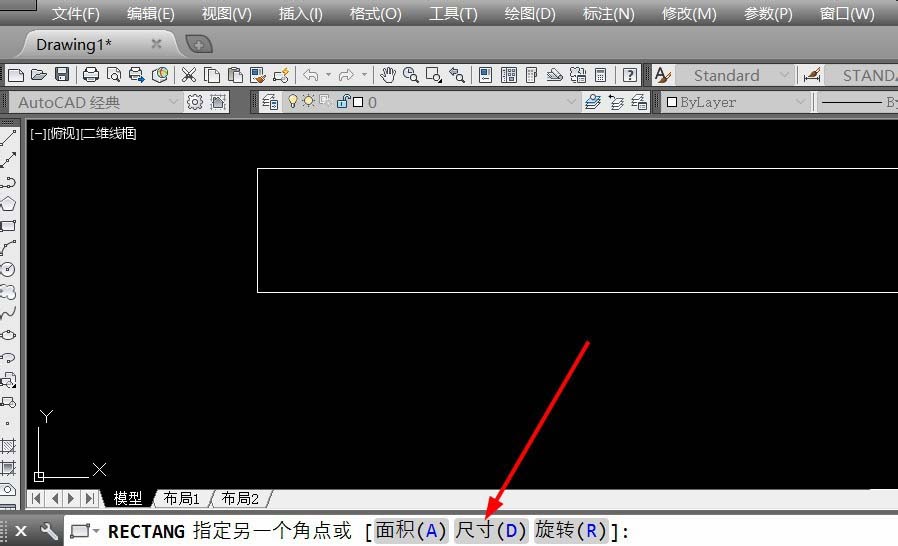 2、點擊繪圖區繪制矩形,命令欄中點擊尺寸。