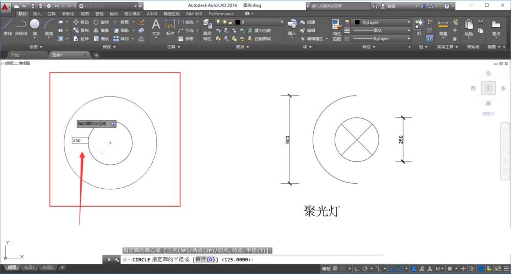 3、與步驟二一樣關鍵要同圓心,畫一個半徑為250的圓。