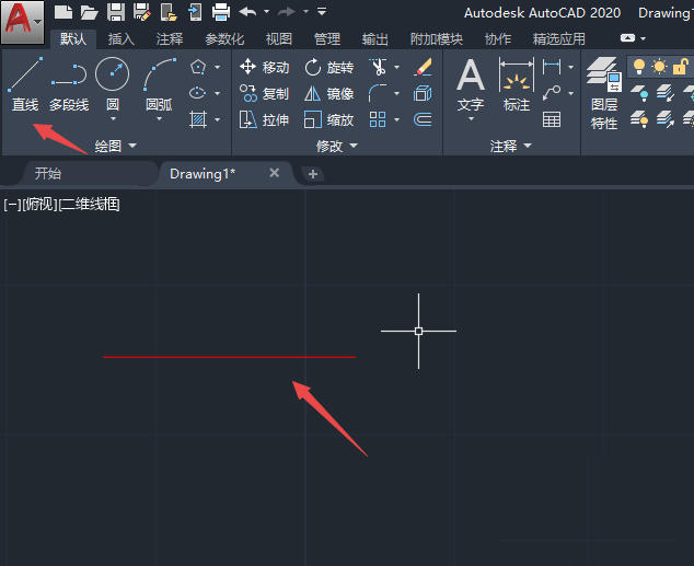 2、然后點擊直線,之后我們在文檔中畫一根直線,我們可以看到直線顯示的是紅色了,說明圖層我們更改后已經有了效果了。線寬這里是無法查看的,更改的也是對的,只是我們肉眼無法識別罷了。