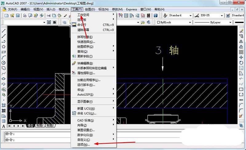 2、進入AUTOCAD后點擊工具再選擇選項按鈕,如圖所示;