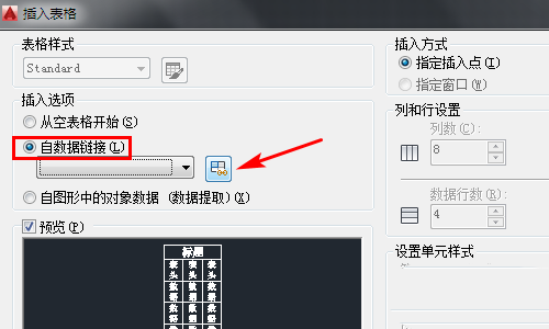 4、在“插入表格”對話框中,”插入選項“選擇“自數據鏈接”,然后單擊如下圖所示的按鈕,打開“選擇數據鏈接”對話框。