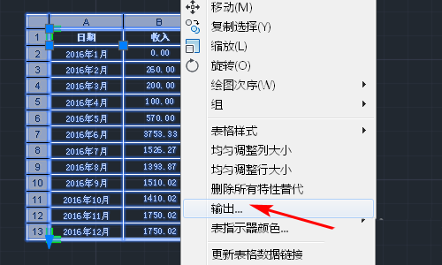 2、選中表格,單擊右鍵,在彈出的右鍵菜單中選擇【輸出】選項。