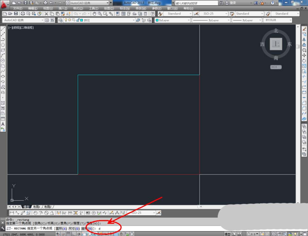 2、點擊【矩形工具】,按圖示在命令欄輸入:d并按下空格鍵,輸入長度數值:2000并按下空格鍵,繼續輸入寬度數值:2000并按下空格鍵,完成矩形圖案的繪制(如圖所示);