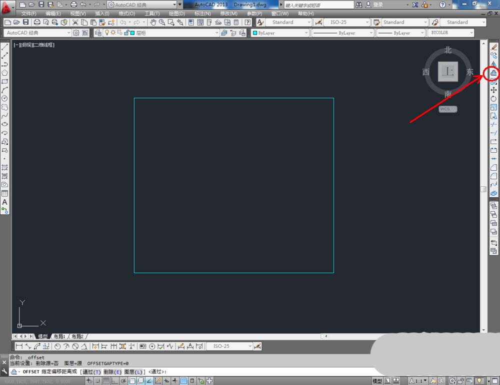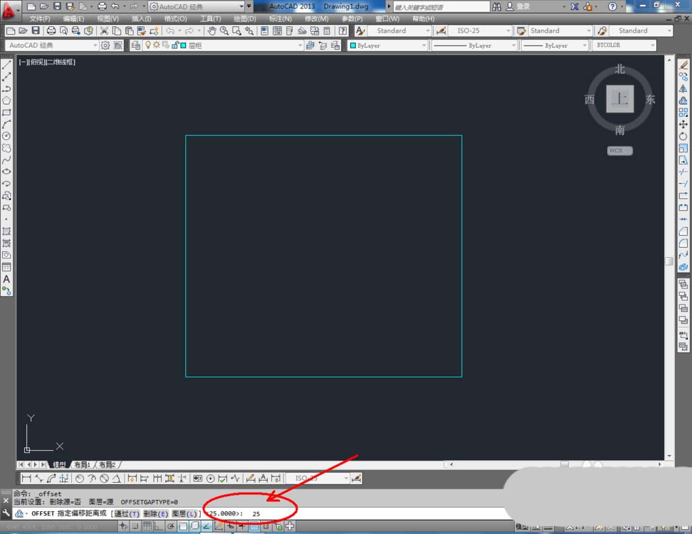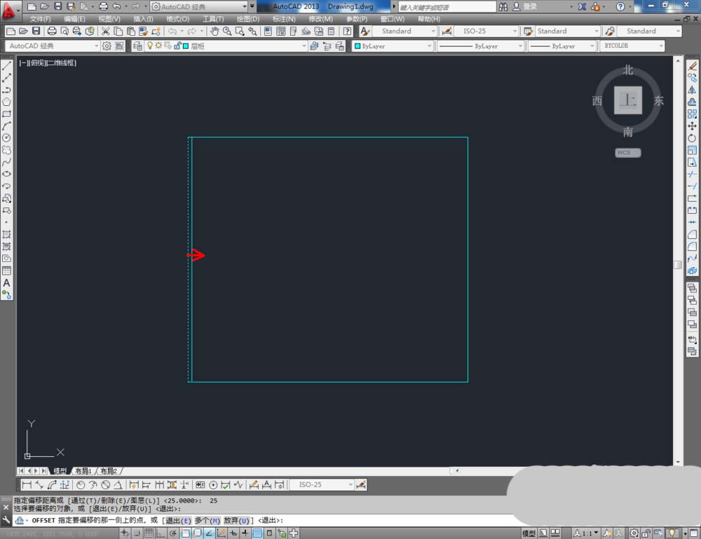 3、點擊右邊工具欄中的【偏移工具】,在命令欄輸入數值:25后,對側邊進行向內偏移。繼續點擊【偏移工具】,在命令欄輸入偏移數值:80后,對圖案底邊進行向上偏移;輸入數值:50,對圖案頂邊進行向上偏移,并調整好左右兩條側邊上的端點(如圖所示);