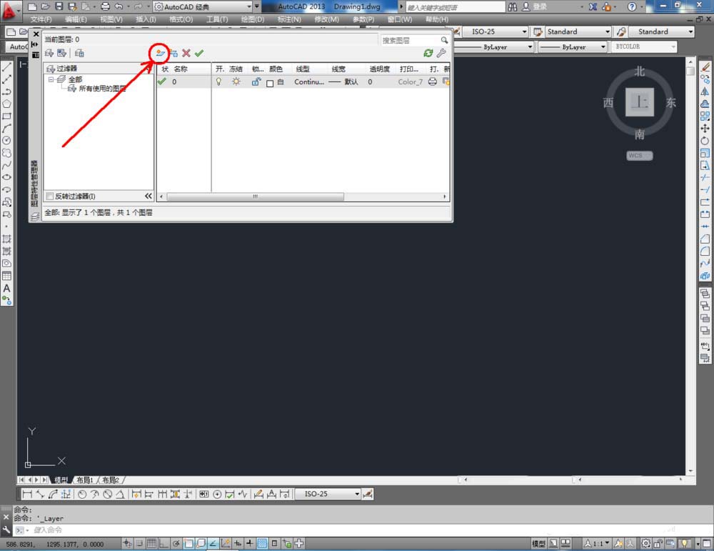 1、打開AutoCAD 2013軟件,點擊【圖層特性管理器】,點擊【新建圖層】,將圖層命名為:衣柜。點擊色塊,按圖示設置一個圖層顏色,完成衣柜圖層的設置(如圖所示);