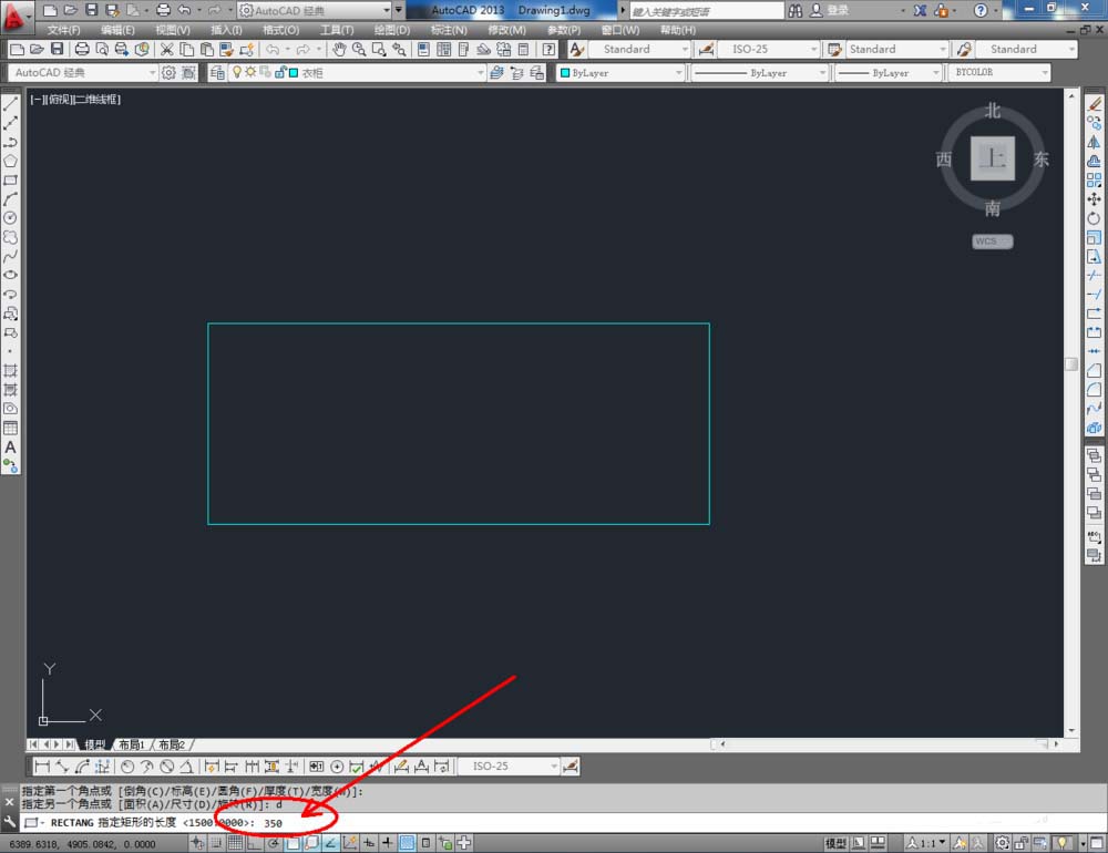3、點擊【矩形工具】,按圖示在命令欄輸入:d并按下空格鍵,輸入長度數值:350并按下空格鍵,繼續輸入寬度數值:60 0并按下空格鍵,完成矩形圖案的繪制(如圖所示);
