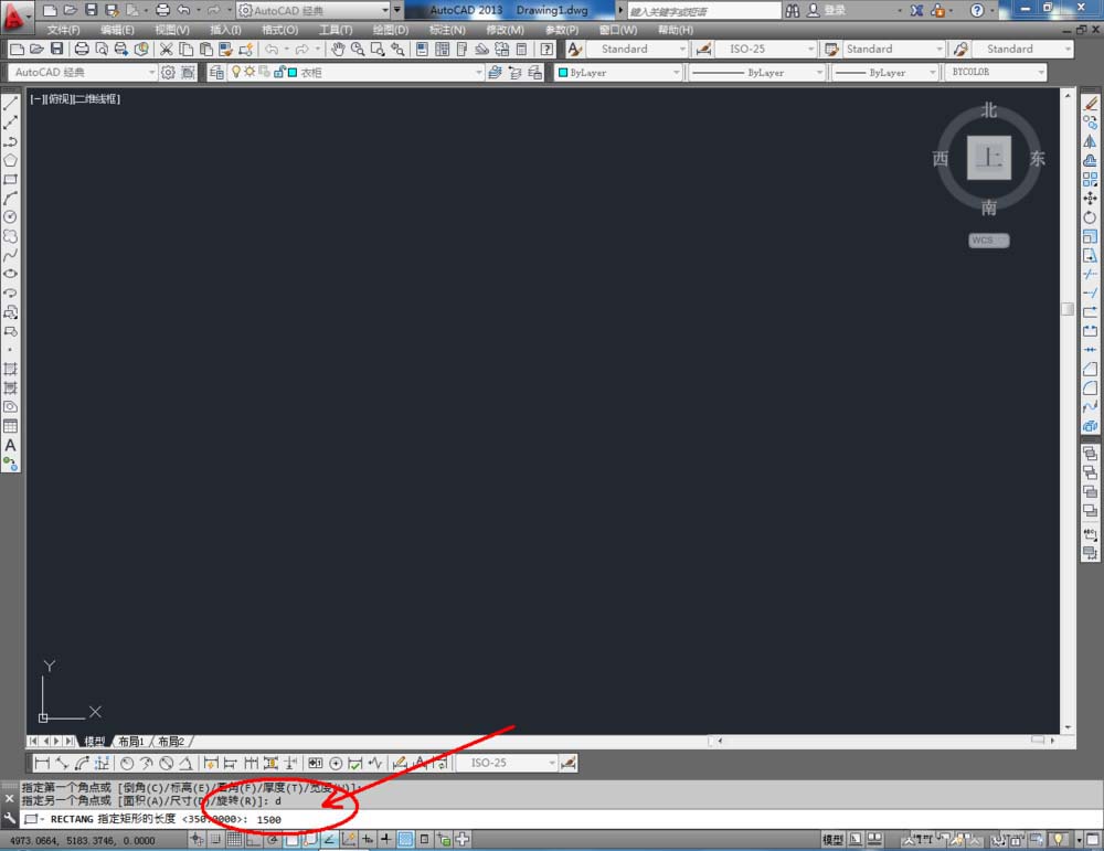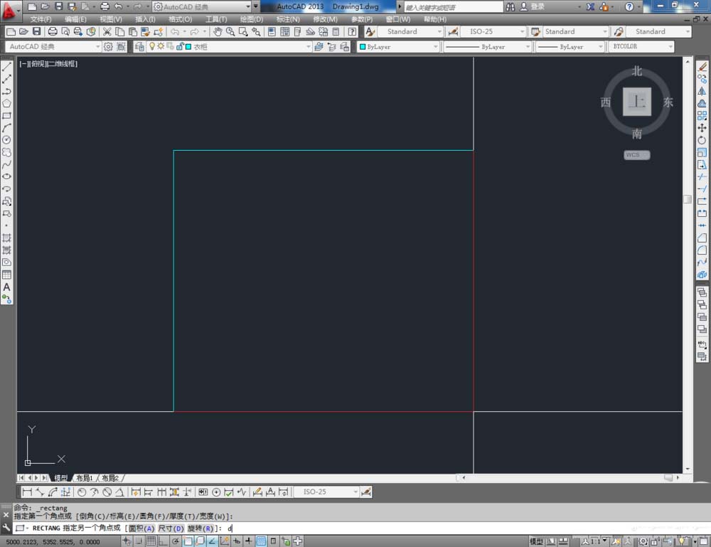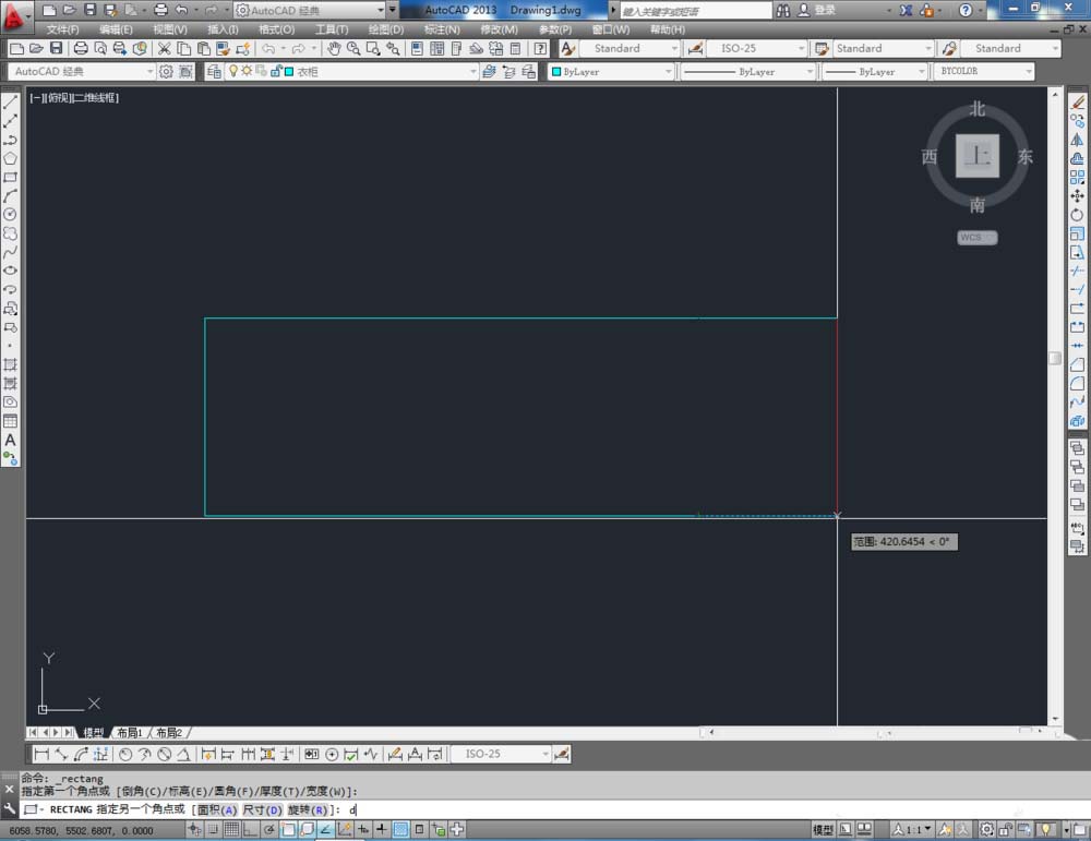 2、點擊【矩形工具】,按圖示在命令欄輸入:d并按下空格鍵,輸入長度數值:1500并按下空格鍵,繼續輸入寬度數值:60 0并按下空格鍵,完成矩形圖案的繪制(如圖所示);