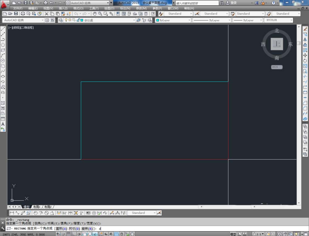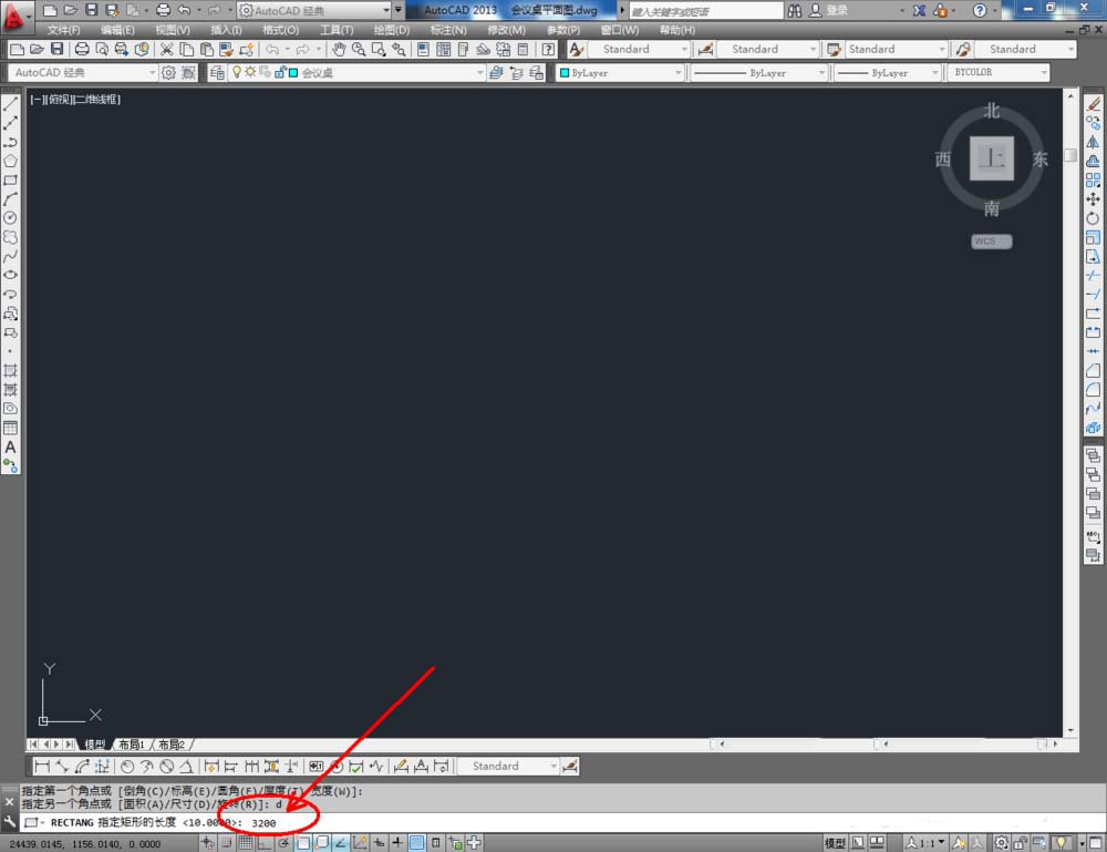 2、點擊【矩形工具】,按圖示在命令欄輸入:d并按下空格鍵,輸入長度數值:3200并按下空格鍵,繼續輸入寬度數值:1500并按下空格鍵,完成矩形圖案的繪制(如圖所示);