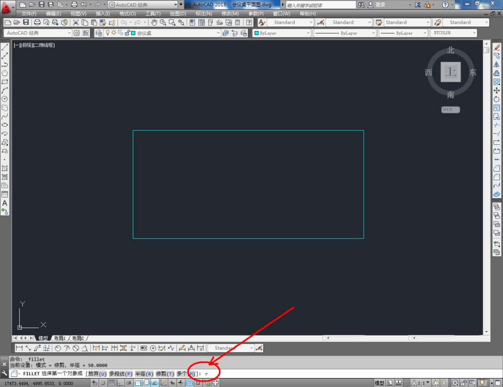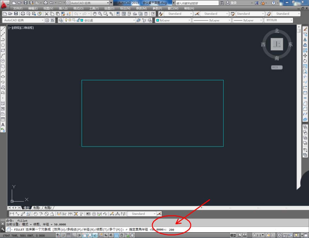 3、點擊右邊工作區中的【圓角】圖標,在命令欄中輸入:r并按下空格鍵,繼續輸入半徑數值:200并按下空格鍵。鼠標依次點擊矩形圖案相鄰的兩條邊線,完成圓角處理。同樣的步驟,依次完成另外三個角的圓角處理(如圖所示);