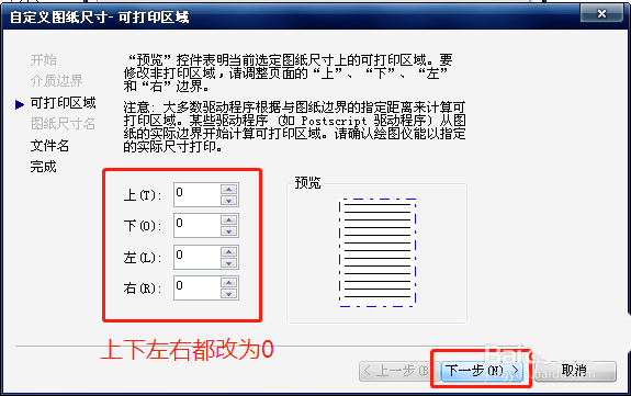 7、在“自定義圖紙尺寸-可打印區(qū)域”對(duì)話框中,上、下、左、右都改為0,點(diǎn)擊【下一步】。