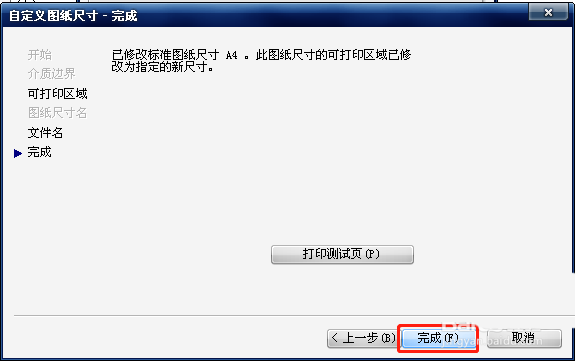 9、彈出【自定義圖紙尺寸-完成】對(duì)話框,可直接單擊【完成】。最后對(duì)剛才打開的對(duì)話框都按【確定】,關(guān)閉對(duì)話框,直到再次回到“打印-模版”對(duì)話框。