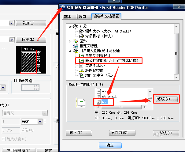 6、在彈出的對(duì)話框中的“設(shè)備和文檔設(shè)置”選項(xiàng)卡中,選中“修改標(biāo)準(zhǔn)圖紙尺寸(可打印區(qū)域)”。然后在下面的“修改標(biāo)準(zhǔn)圖紙尺寸”框中選中“A4”。再單擊右側(cè)的【修改】按鈕,彈出“自定義圖紙尺寸-可打印區(qū)域”對(duì)話框。