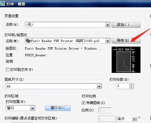 3、在“打印-模型”對(duì)話框中,在打印機(jī)名稱的下拉框中選擇帶PDF字樣的選項(xiàng)——“Foxit Reader PDF Printer”。設(shè)置圖紙尺寸為“A4”,打印范圍選擇“窗口”。