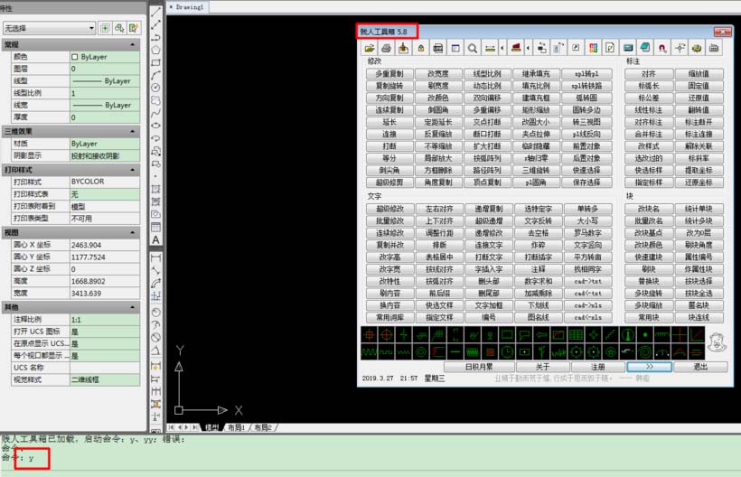7、在命令菜單欄輸入快捷鍵“Y”調出“賤人工具箱”。如圖所示,加載小插件就可以了。