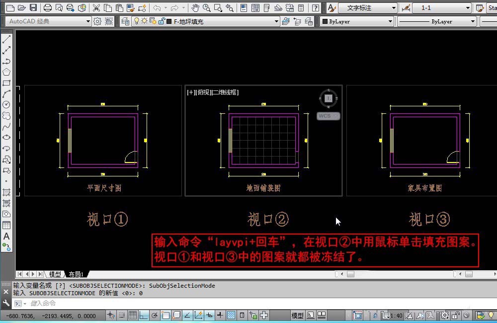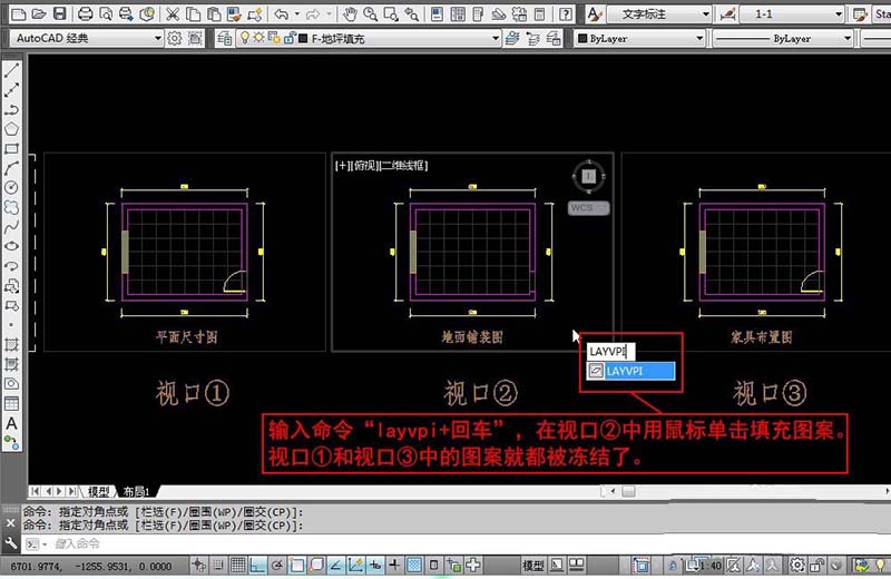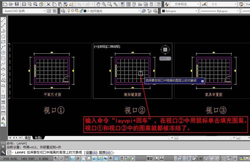 4、現在我們需要在視口②之外的其它視口凍結填充圖層。輸入命令“layvpi+回車”,在視口②中用鼠標單擊填充圖案。視口①和視口③中的圖案就都被凍結了。“layvpi+回車”就是在當前視口之外的其它所有視口凍結當前選擇對象所在的圖層。