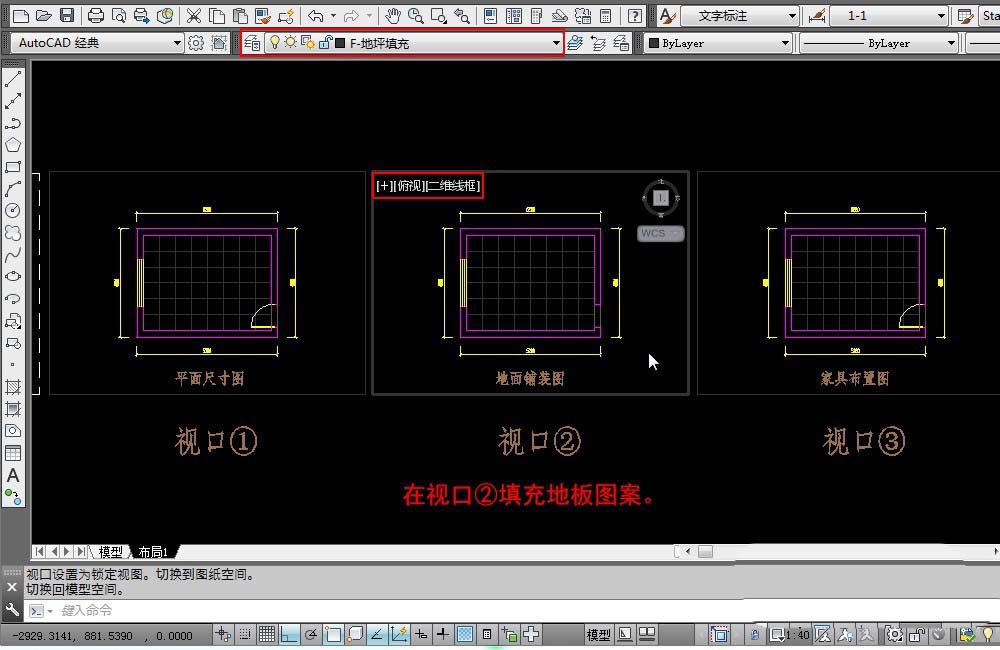 3、建立一個新圖層:F-地坪填充,設置為當前圖層。在視口②填充地板圖案。當然在視口①和視口③也會看到填充的圖案。