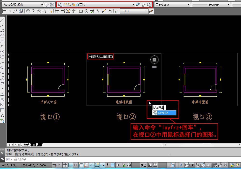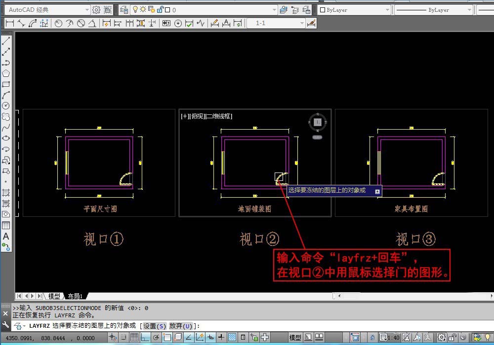 2、現在我們需要在視口②凍結門圖層。輸入命令“layfrz+回車”,在視口②中用鼠標單擊門的圖形。就可以在視口②凍結門圖層。“layfrz+回車”就是在當在當前視口凍結選擇對象所在的圖層。
