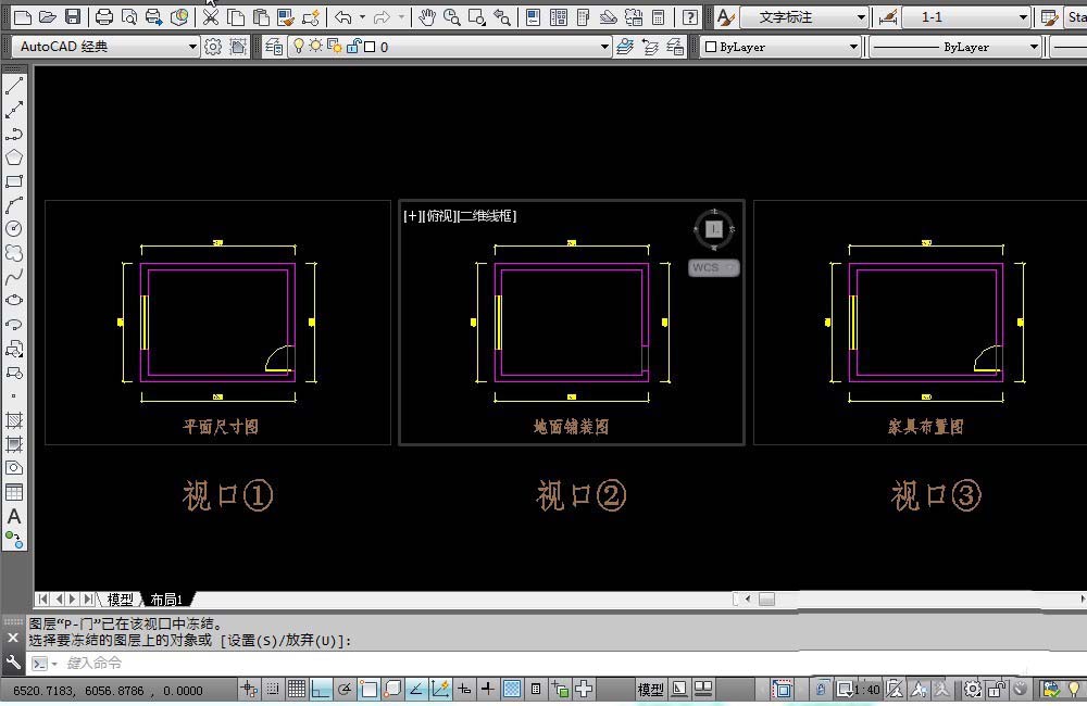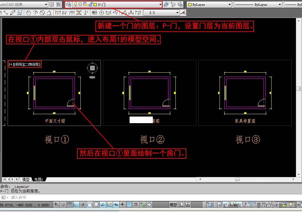 1、如圖所示布局1有3個視口。在視口①內部雙擊鼠標,進入布局1的模型空間。新建一個門的圖層:P-門,設置門層為當前圖層。然后在視口①里面繪制一個房門。在視口②,視口③中當然也會看到這個門。