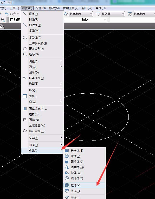 4、做好面域之后我們開(kāi)始對(duì)它拉伸--繪圖--實(shí)體--拉伸,我們可以看一下這個(gè)拉伸之后就是一個(gè)立體了,看著都是線條,填充之后才漂亮