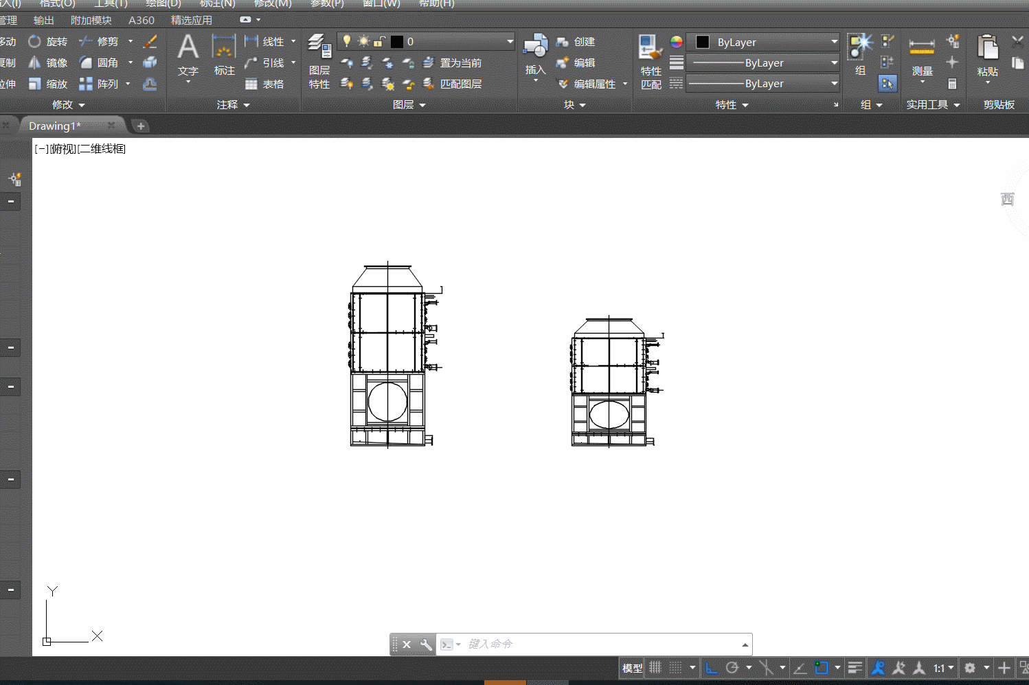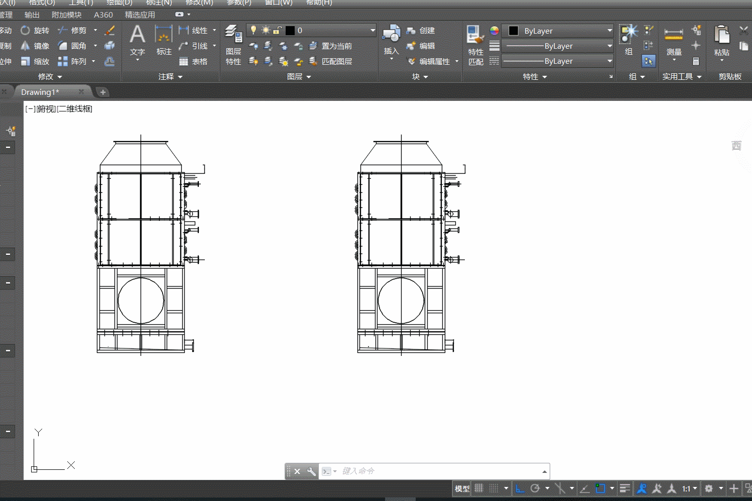 1、打開設(shè)備圖紙,大多數(shù)為正視圖和側(cè)視圖;(由于廠家的外觀尺寸保護(hù)措施,關(guān)鍵尺寸肯定是正確的,以保證安裝定位到位;但是,如果你將設(shè)備視圖,縮放至1:1的比例,那么比例一定是失調(diào)的);操作效果如下圖所示,左側(cè)為原始側(cè)視圖,右側(cè)為軸測視圖。
