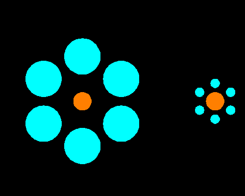 6、將中間的兩個圓填充為一種顏色,周邊的環繞圓填充為另一種顏色。看一下,中間的兩個圓看起來哪個大哪個小?是不是被1/2大小圓圍繞的圓形顯得更大些了。可是開始第1步我們就已經明確了,兩個圓是等徑大小的,這就是著名的艾賓浩斯錯覺~