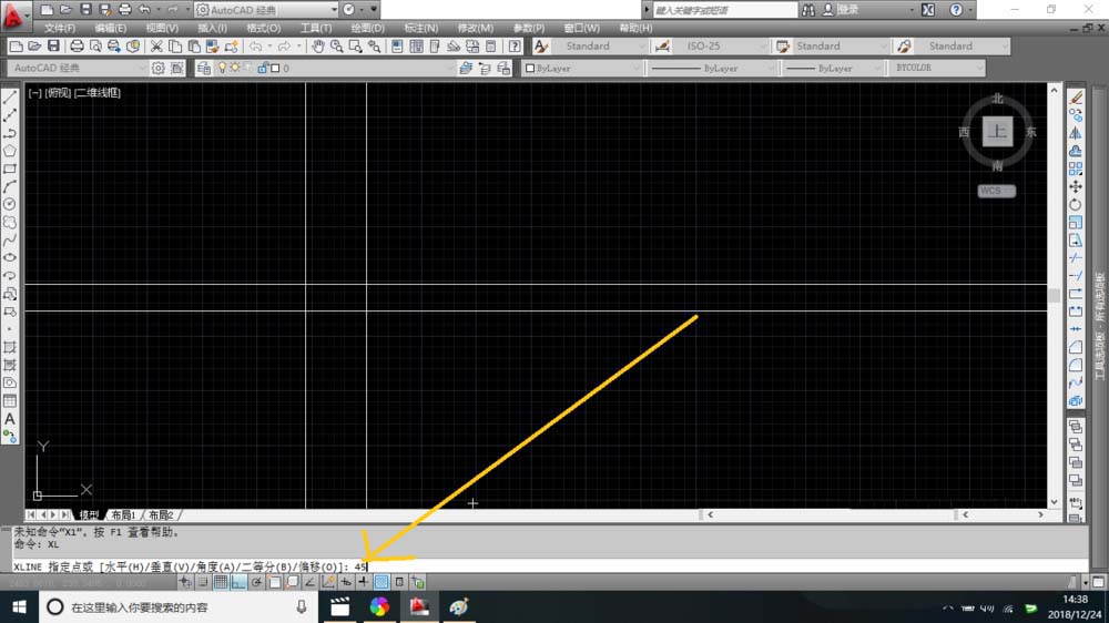 2、然后再在命令欄中輸入45即可在繪圖中繪制構(gòu)造線(xiàn)。