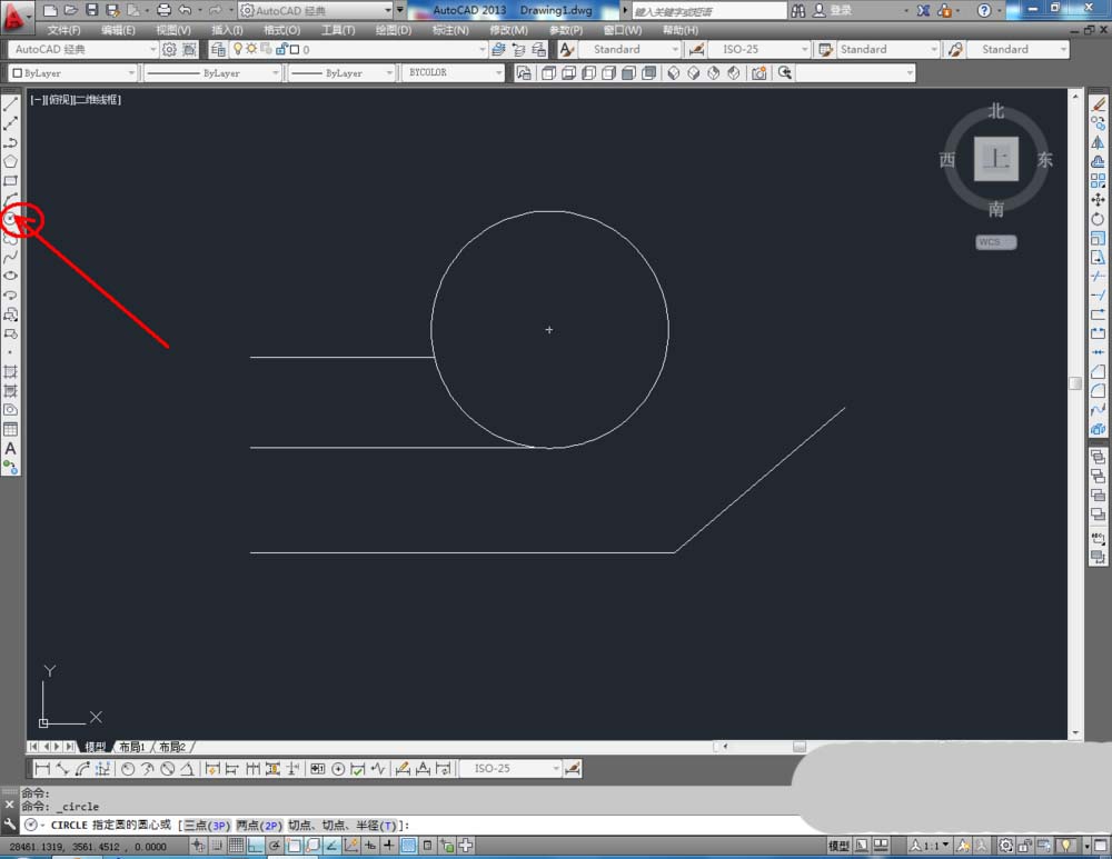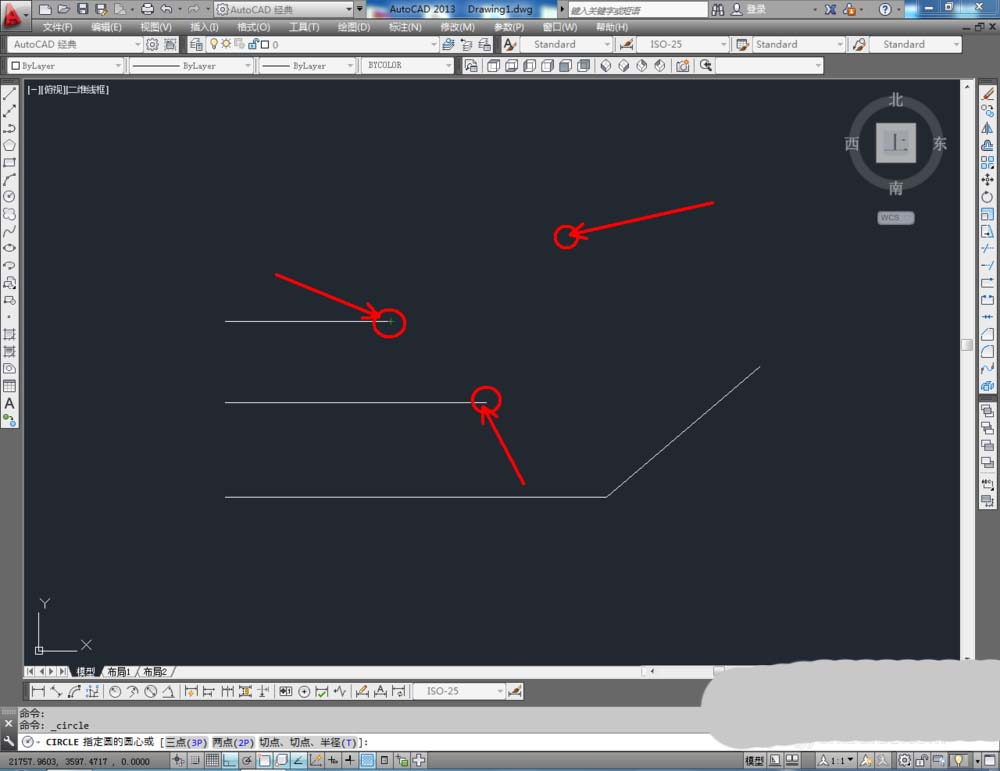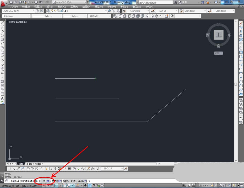2、點擊【圓工具】,鼠標點擊下方命令欄中的【三點(3P)】,按圖示確定好圓的三個點的位置后,按下空格鍵將圓繪制出來(如圖所示);