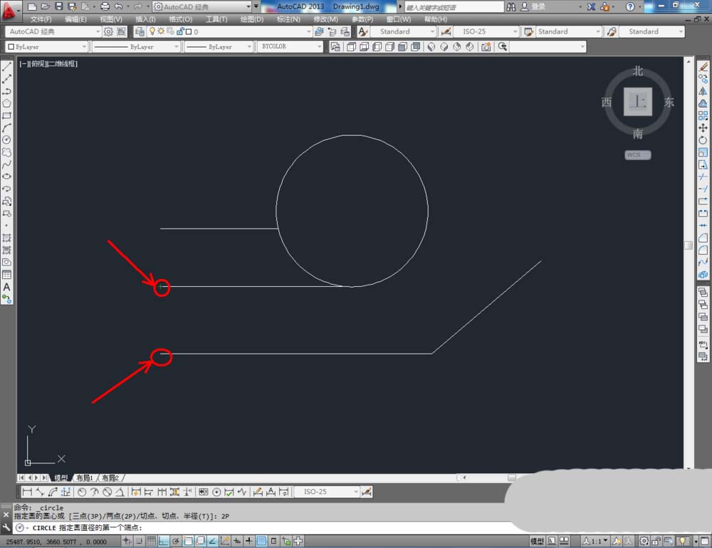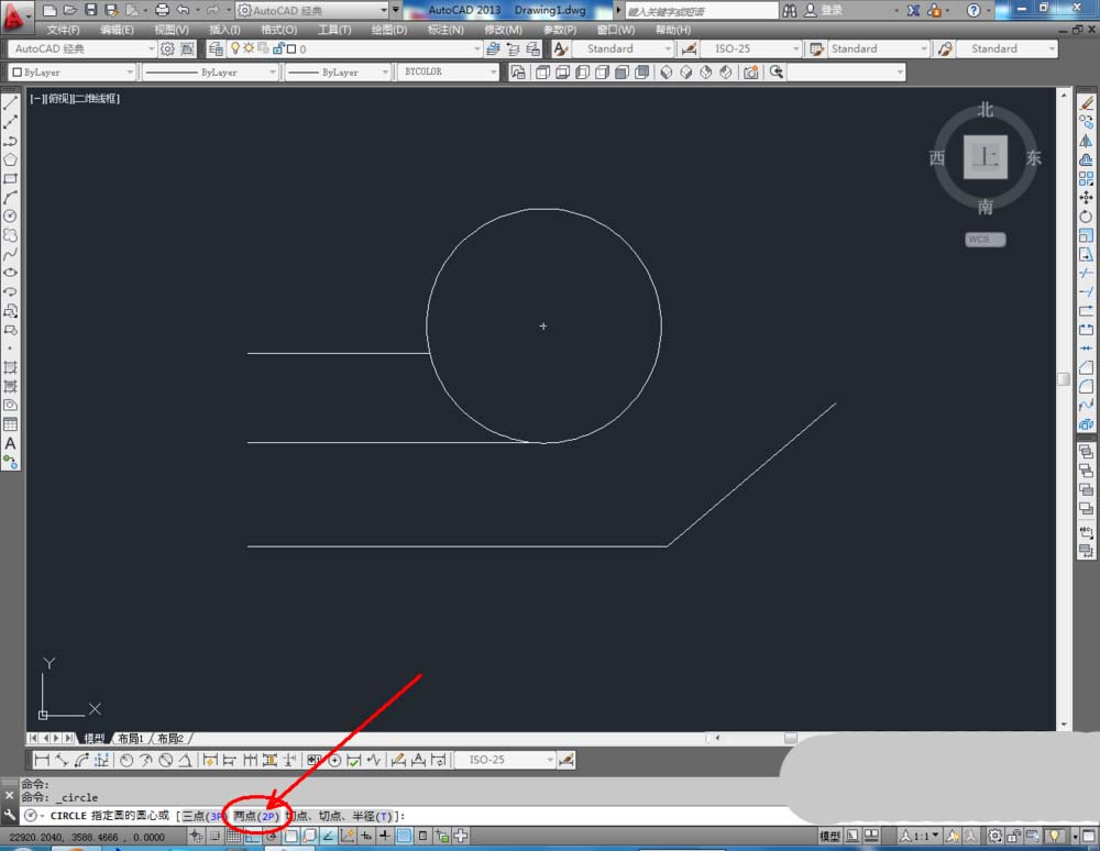 3、點擊【圓工具】,鼠標點擊下方命令欄中的【兩點(2P)】,按圖示確定好圓的兩個點的位置后,按下空格鍵將圓繪制出來(如圖所示);