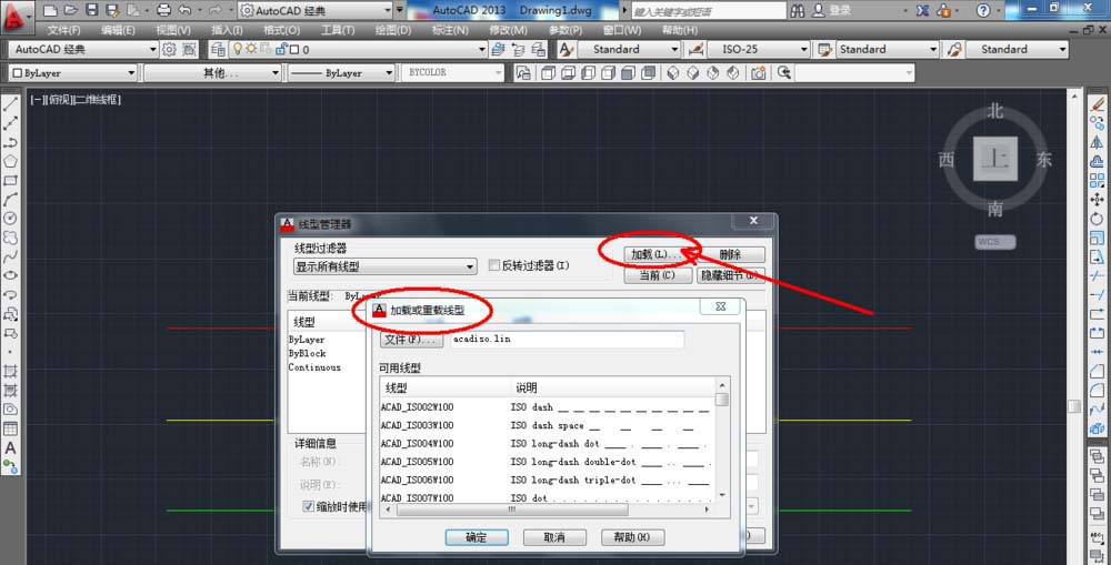 2、點擊特性欄中的【線型控制】,點擊【其他】,彈出線型管理器。點擊【加載】,選中【IS002W100】點擊【確定】。完成后,將線型設置為【IS002W100】(如圖所示);