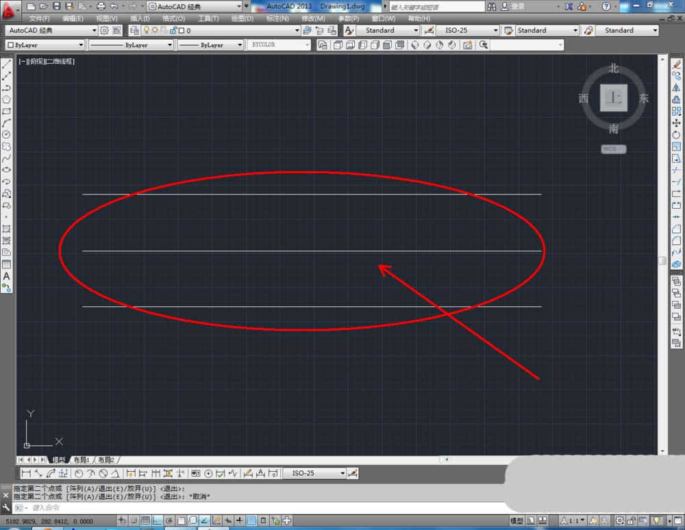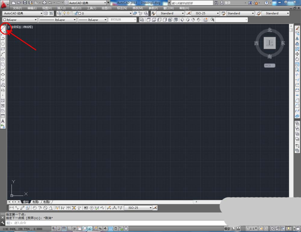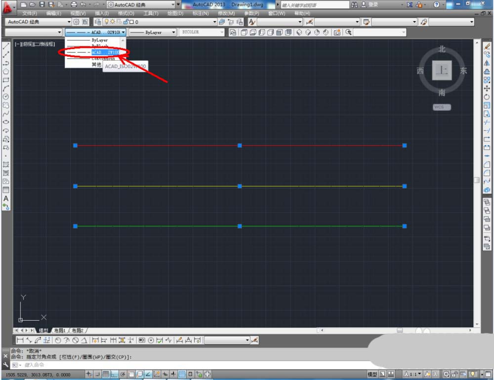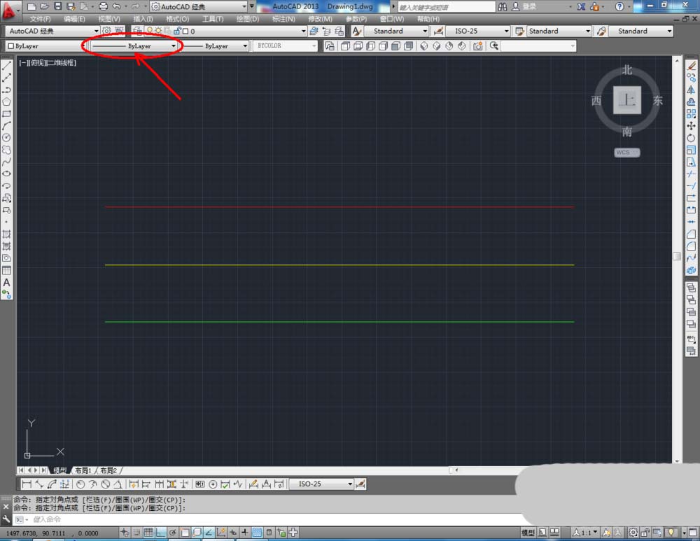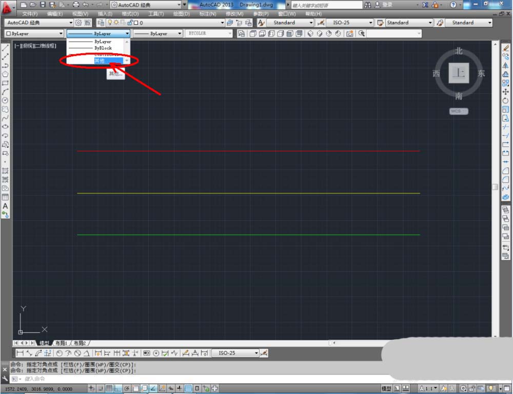 1、打開AutoCAD2013軟件,點擊【直線工具】,在作圖區域繪制3條線段。點擊顏色選擇框,分別將3段線段設置為3種不同的圖層顏色(如圖所示);