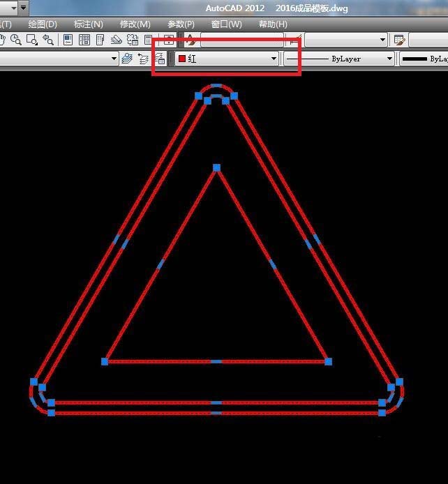 7、如下圖所示,將里面兩個三角形之間填充上紅色。具體步驟:輸入H,回車,出現一個“圖案填充和漸變色”對話框,在對話框中“樣例”一欄選擇“SOLID”,在顏色一欄選擇“紅色”,添加邊界的時候注意:在里面兩個三角形之間點一下鼠標左鍵就可以了,然后回車,最后“確定”就可以了。