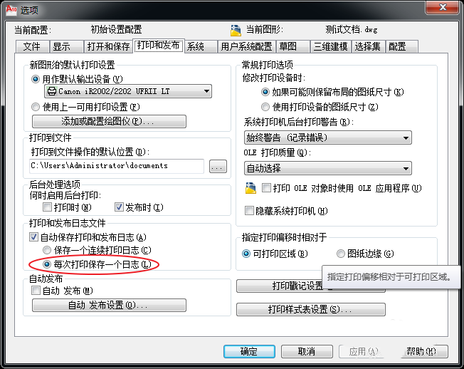 在“打印和發(fā)布日志文件”區(qū)域,可以看到,“自動(dòng)保存打印和發(fā)布日志”和“每次打印保存一個(gè)日志”已經(jīng)勾選。這樣設(shè)置,就會(huì)導(dǎo)致,每次打印都會(huì)生成一個(gè)plot文件,生成的位置一般在圖紙文檔所在文件夾。