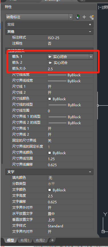 4、在特性修改欄中,找到箭頭的部分,可以選中箭頭,修改箭頭的形狀并進行大小的改變,