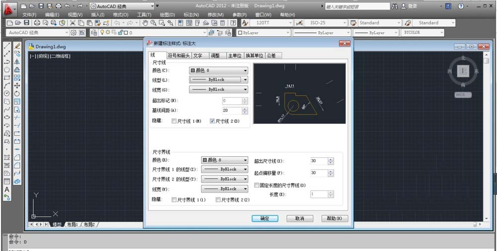 5、點擊繼續之后,再點擊線的尺寸線和延伸線的設置,我們通常用到的數據如下面圖紙所示,設置好之后點擊確定。