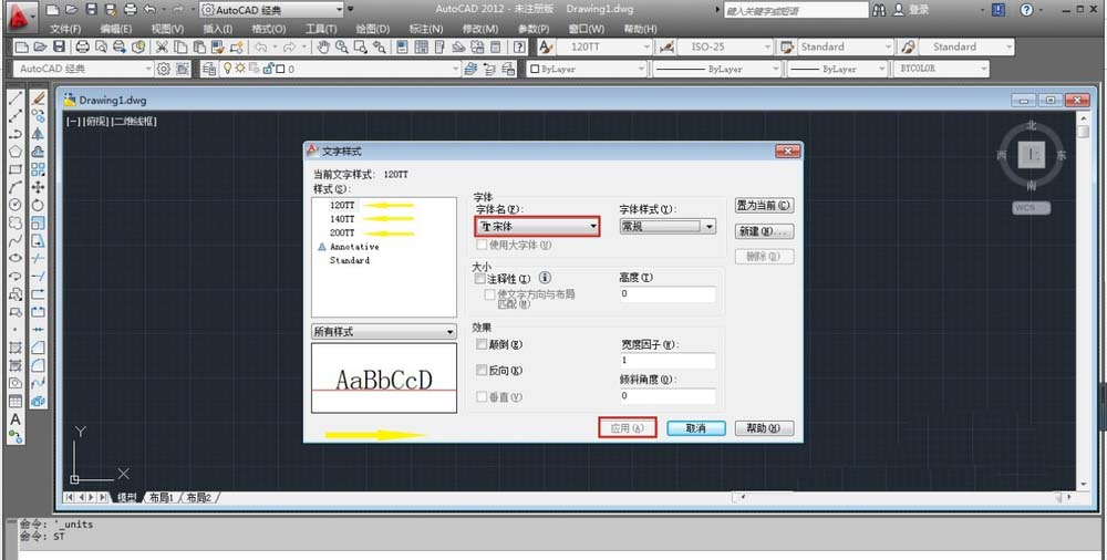 2、字體的樣式和大小的修改,我們在作圖的時候通常用的事宋體,能用到的字體大小一般是200、140、120的,按住快捷鍵st進行修改,如圖所示。