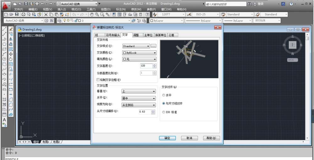 7、文字的大小大標注使用的是120、中標注字的大小100。調整方面選擇尺寸線的上方,不帶引線,如下圖所示。