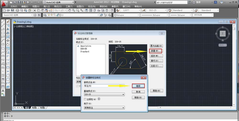 4、標注樣式的設置,點擊標注里面的標注樣式。點擊新建分別設置大、中、小三個標注,點擊繼續,如圖所示。