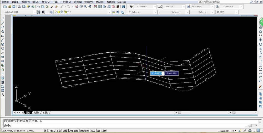 7、繪制邊界網格: 選擇“繪圖”|“建模”|“網格”|“邊界網格”命令(EDGESURF),可以使用4條首尾連接的邊創建三維多邊形網格。這時可在命令行的“選擇用作曲面邊界的對象 1:”提示信息下選擇第一條曲線,在命令行的“選擇用作曲面邊界的對象 2:”提示信息下選擇第二條曲線,在命令行的“選擇用作曲面邊界的對象 3:”提示信息下選擇第三條曲線,在命令行的“選擇用作曲面邊界的對象4:”提示信息下選擇第四條曲線