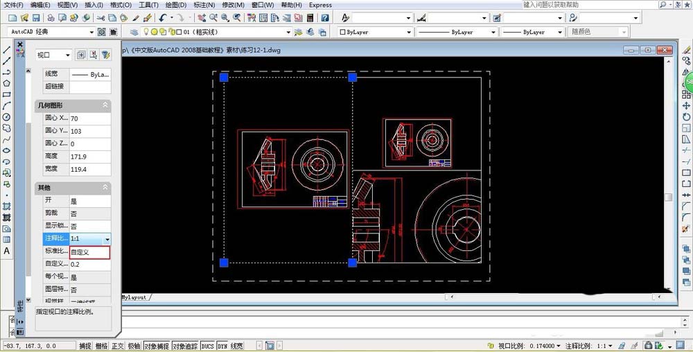 如果布局圖中使用了多個浮動視口時,就可以為這些視口中的視圖建立相同的縮放比例。這時可選擇要修改其縮放比例的浮動視口,在“特性”窗口的“標準比例”下拉列表框中選擇某一比例,然后對其他的所有浮動視口執行同樣的操作,就可以設置一個相同的比例值。