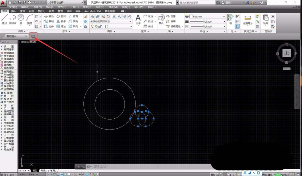 2、因此我們要從CAD程序內(nèi)部開啟新的圖紙,在CAD窗口的標簽欄中,我們可以看到當前的圖紙,以及一個加號標簽,我們點擊加號。