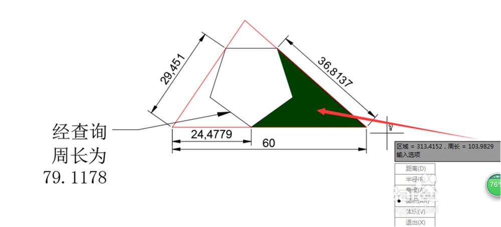 7、標(biāo)注所求尺寸,查詢陰影面積,查詢五邊形周長(zhǎng)。
