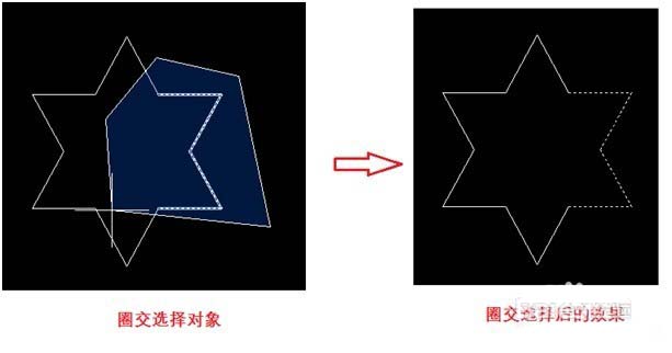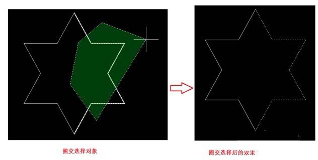圈交是一種多邊形窗交選擇方法,與窗交選擇對象的方法類似,不同的是圈交使用多邊形邊界框選圖形,部分或全部處于多邊形范圍內的圖形都將被選中。所示的虛線部分為被選擇的部分。