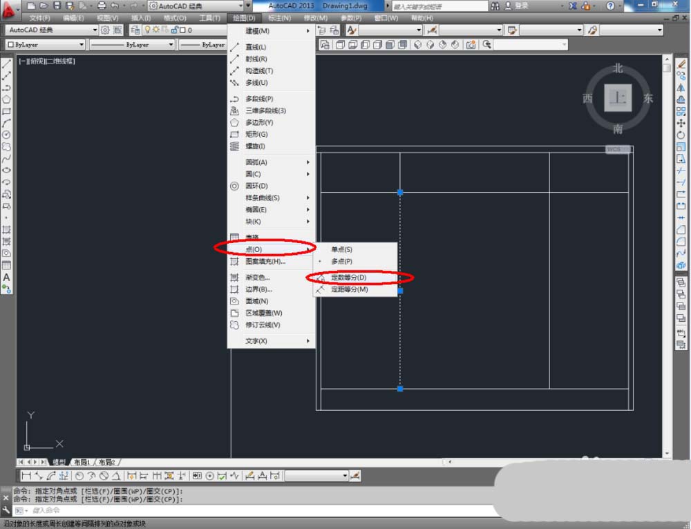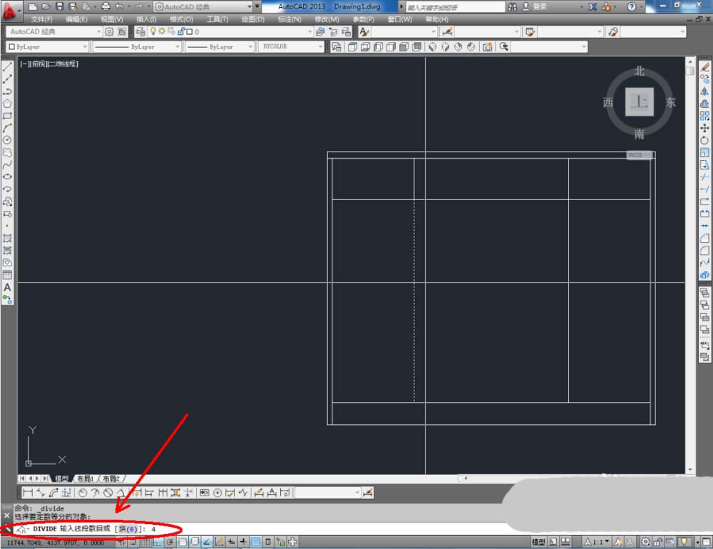 2、接著,開始制作鞋柜隔板(隔板厚度為18mm)。選中圖中線段,點(diǎn)擊【繪圖】-【點(diǎn)】-【定數(shù)等分】,輸入等分值:4,后,敲擊【空格鍵】。完成后,點(diǎn)擊【直線工具】結(jié)合【偏移】命令畫出隔板并復(fù)制出余下隔板(如圖所示);