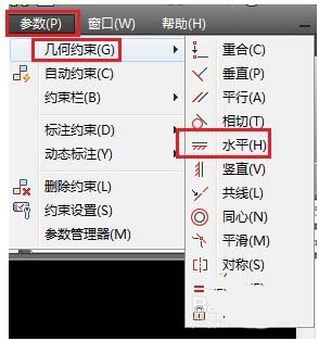 1、菜單欄:鼠標左鍵點擊選擇【參數】-【幾何約束】-【水平】,鼠標左鍵點擊【水平】命令
