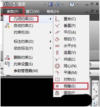 2、菜單欄:鼠標左鍵點擊選擇【參數】-【幾何約束】-【相等】,鼠標左鍵點擊【相等】。